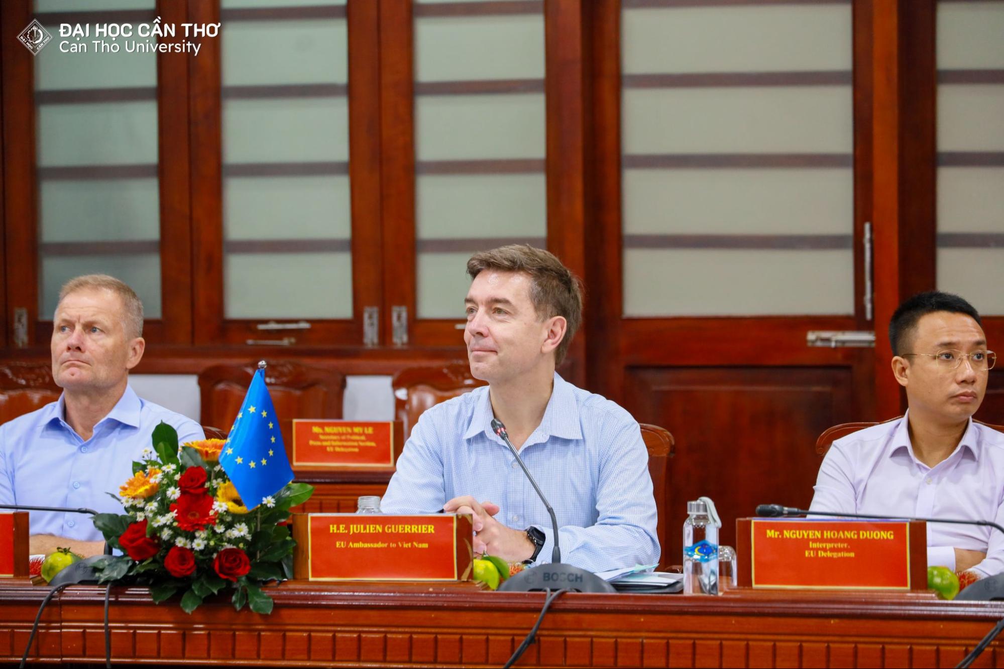 Ông Julien Guerrier bày tỏ niềm vui trước sự đón tiếp từ ĐHCT, đánh giá cao quan hệ hợp tác ngày càng phát triển giữa EU và Việt Nam, đặc biệt là với ĐHCT. Ông ấn tượng với kết quả hợp tác trong các lĩnh vực biến đổi khí hậu, nông nghiệp công nghệ cao, thủy sản, an ninh lương thực và an ninh nguồn nước và xem đây là hướng đi quan trọng thúc đẩy phát triển bền vững ĐBSCL và mở rộng hợp tác EU- ĐHCT trong tương lai.