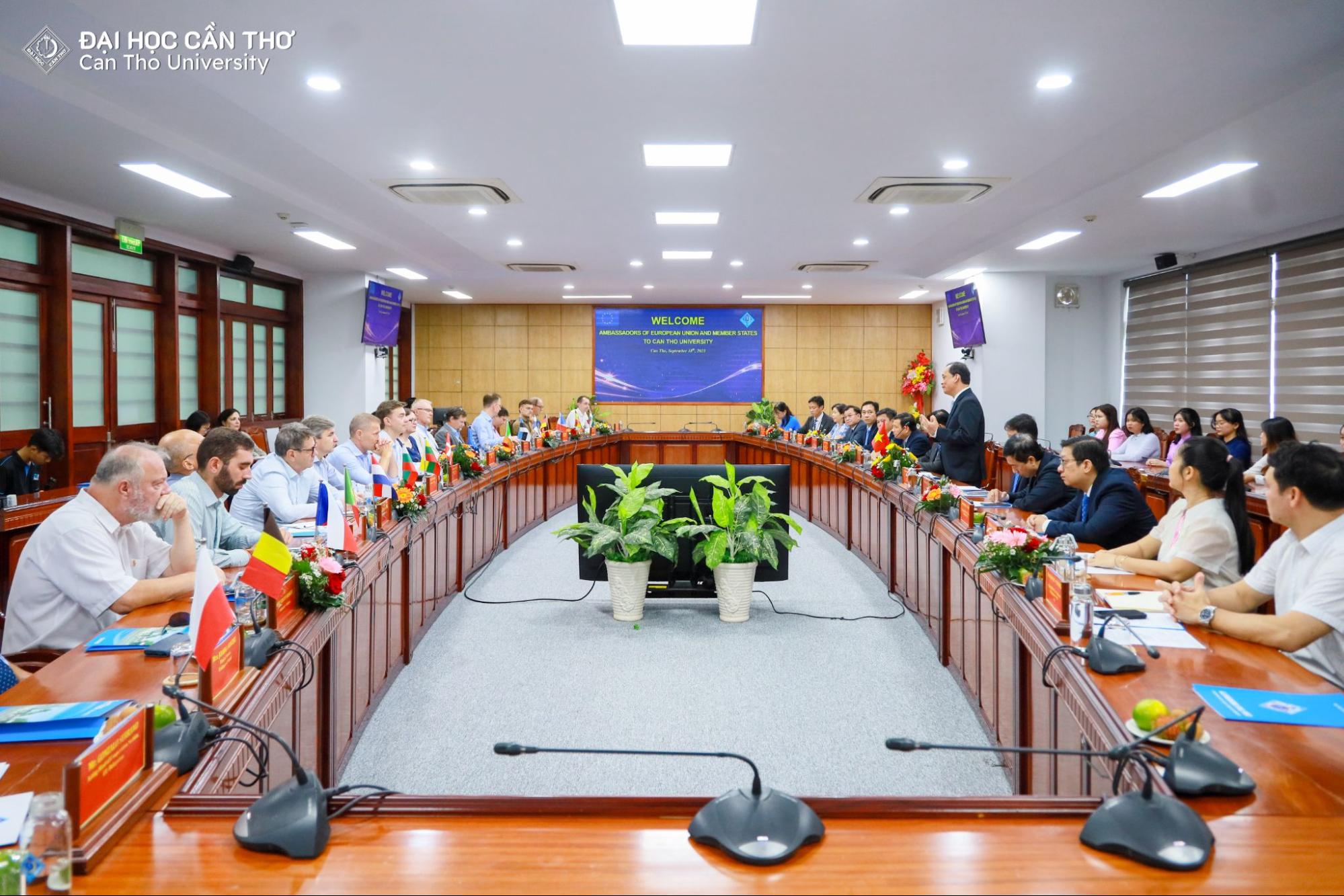 Ngày 18/09/2025, Đại học Cần Thơ (ĐHCT) long trọng đón tiếp Phái đoàn Liên minh Châu Âu (EU) tại Việt Nam do ông Julien Guerrier, Đại sứ Liên minh châu Âu tại Việt Nam dẫn đầu, cùng các Đại sứ đại diện các nước thành viên EU gồm: Đan Mạch, Ireland, Lithuania, Estonia, Bulgaria, Phần Lan, Croatia, Đức, Bồ Đào Nha, Pháp, Cộng hòa Séc, Tây Ban Nha, Bỉ, Hungary, Ba Lan.
